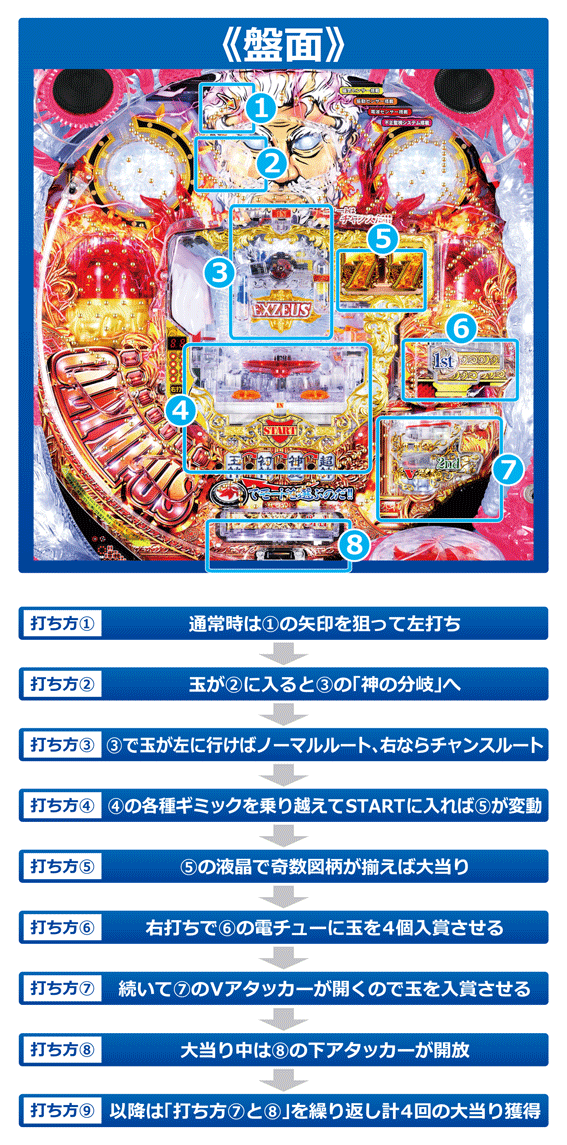 大当りを獲得したら、まずは右打ちで⑤の電チューに玉を4個入賞させる。ココで保留を4つ貯めないと最大出玉を獲得できなくなるので注意しよう。4個入賞させると⑥のVアタッカーが開き、ココに玉を入賞させることで大当りが始まり、⑧の下アタッカーが開放。大当り終了後は再度Vアタッカーが開くので、玉を入賞させて2回目の大当りをスタートさせよう。この繰り返しで約5000個の出玉を獲得できるぞ。