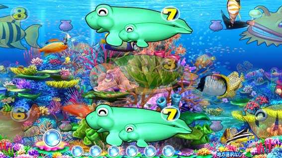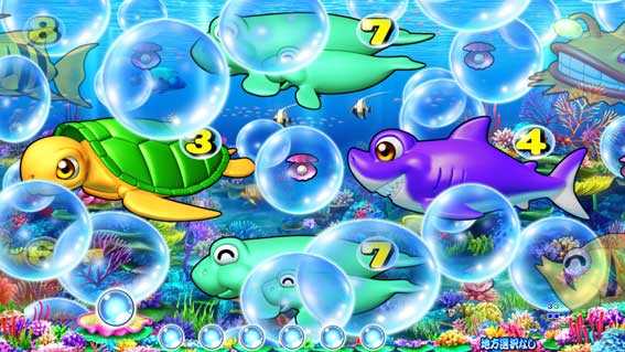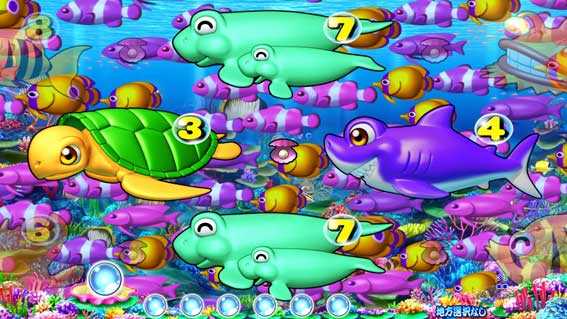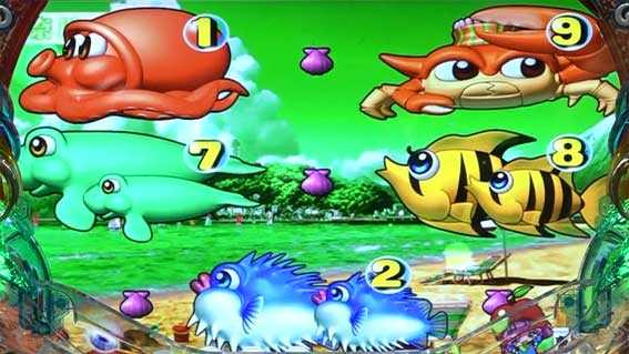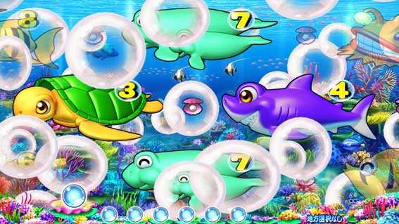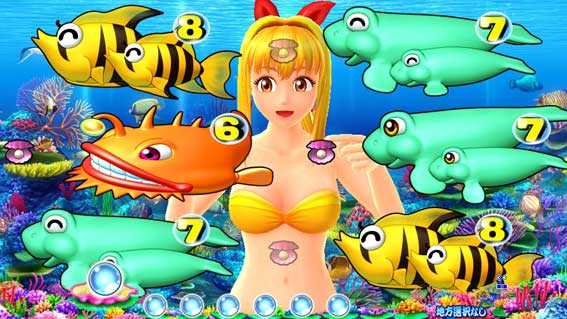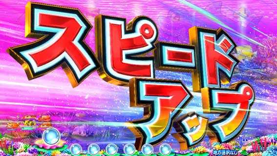 シングルライン限定のSPリーチ。画面下部から珊瑚礁がせり上がり、中図柄が拡大縮小しながら移行する。珊瑚礁の位置が通常よりも高ければチャンスアップ!