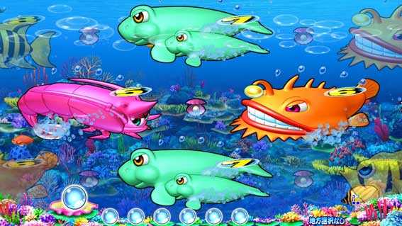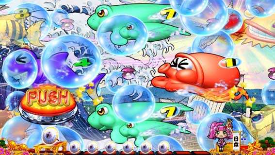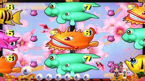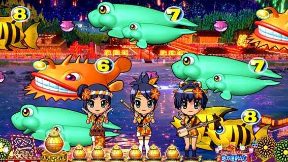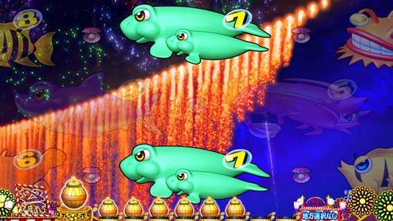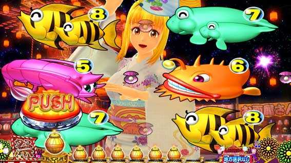 やぐらから視点が右方向に進むと発展し、仕掛け花火をバックに中図柄がスクロールする。ボタン押しで泡or魚群が出現!