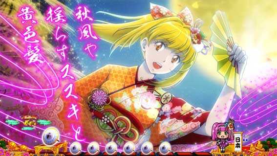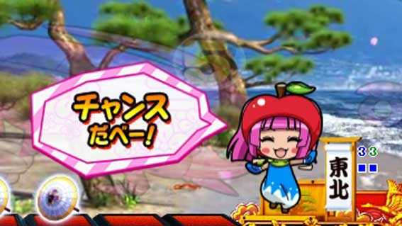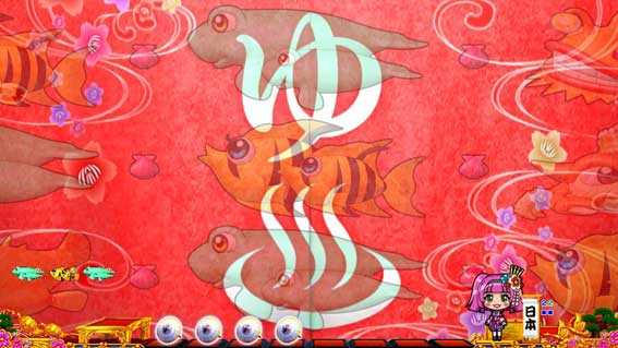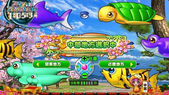待機画面中に十字ボタンの左右を押すと、ご当地を選ぶことが可能。ご当地は北海道・東北・関東・中部・近畿・中国・四国・九州の全8種類で、ジャパンフラッシュや魚群などでは、ご当地ゆかりの演出を楽しむことができる。