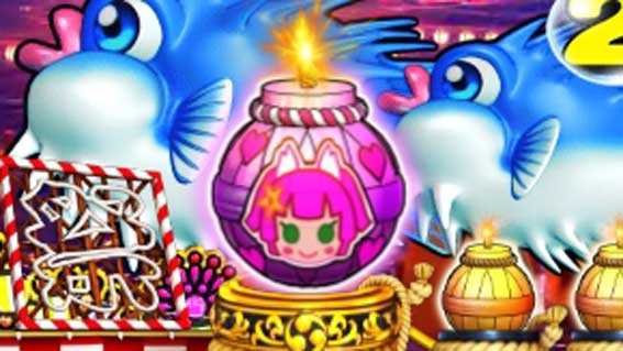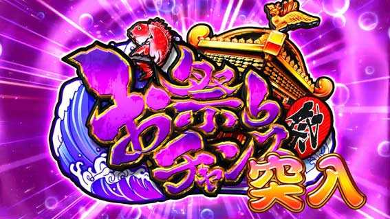 中図柄に赤クジラッキーが停止すると、ランクアップ型確変大当りの「お祭りボーナス」が発生。2R目と5R目にボタン演出が発生し、成功すれば継続となり、最大10ラウンドとなる。発生契機は「リーチが止まらない」や「変動がいつもより長い」など。