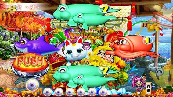 演出に関しては、選べる3モード「海モード」「ジャパンモード」「お祭りモード」を搭載。前作にもあった「ご当地演出」は大幅にパワーアップしており、ご当地ウリンが方言&衣装で応援したり、ご当地魚群が出現することも!? 一発告知のジャパンフラッシュも全27種類のご当地ver.が用意されているぞ。さらに2時間に1回訪れるRTC「スペシャルアイマリンタム」も搭載。様々なアイマリンや楽曲に出会えるライブ中は、スペシャル魚群出現で大当り濃厚だ。