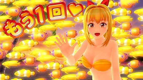大当り終了後の「もう1回」文字出現中に、マリンの背後を金魚群が通過すると保留内での確変大当りが濃厚に。