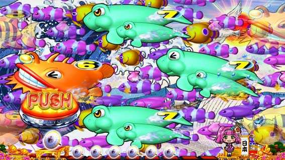 中図柄が黒潮の流れに踏ん張るようにスクロールするシングルライン限定のSPリーチ。潮の流れがいつもより速ければチャンスアップ!