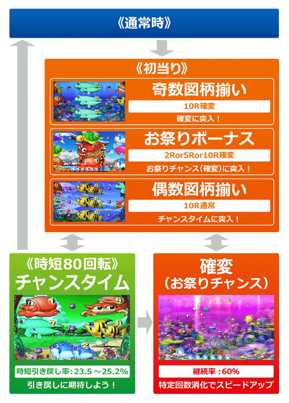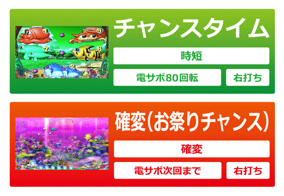 奇数図柄揃い後やラウンド演出成功、お祭りボーナス終了後に突入する次回までの電サポあり確変モード。今作では新搭載の「スピードアップ機能」が搭載されたので、今までの海の確変とは違った楽しみ方ができそうだ。