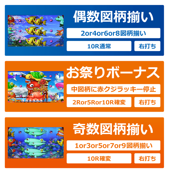 奇数図柄揃いや、お祭りボーナス終了後は次回までの電サポあり確変に突入する。本機では確変中に高速変動機能「スピードアップ」を搭載。スピードアップ中はリーチになれば大当り濃厚なので、ダブルリーチなら奇数か偶数かドキドキできる。