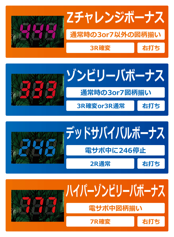 初当りは3Rのみで、3or7揃いの「ゾンビリーバボーナス」後は、時短100回or確変(電サポ次回まで)の電サポモード「Z-ZONE」へ突入する。3or7以外の図柄揃い大当りの「Zチャレンジボーナス」はZ-ZONE突入確定ではないが、非突入でも確変潜伏の可能性があるので即ヤメは厳禁だ。