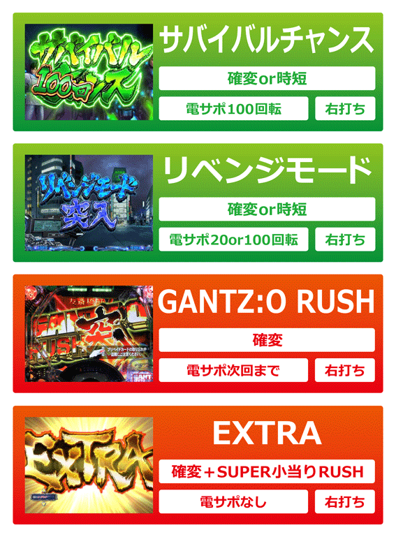 サバイバルBONUS終了後に突入。電サポ100回転の時短or確変で、確変の場合は101回転目にGANTZ:O RUSHへ突入。