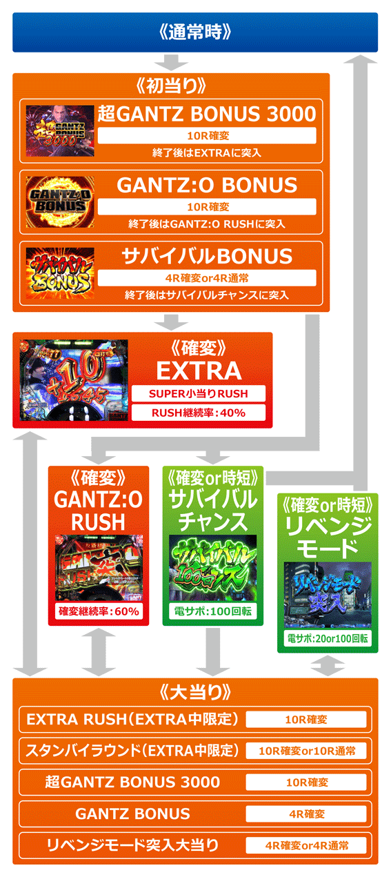 GANTZ:O RUSHは次回大当りまで続く確変で、星人を倒して100てんを取ればEXTRAに突入。確変or時短のチャンスモードは「サバイバルチャンス」と「リベンジモード」の2種類があり、どちらも内部的に確変なら101回転目からはGANTZ:O RUSHに突入する。