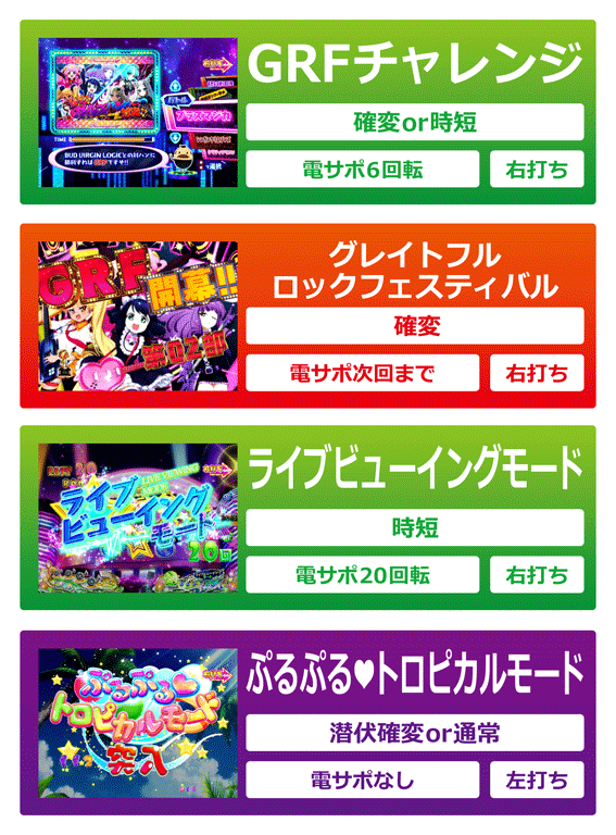 電サポ中の偶数図柄揃い後に突入する電サポ20回転の時短モードで、確変の可能性はナシ。ただし、ココで当たればグレイトフルロックフェスティバルに再突入する。終了後はぷるぷる❤トロピカルモードに突入するが、ライブビューイングモード経由だと通常状態濃厚となるぞ。