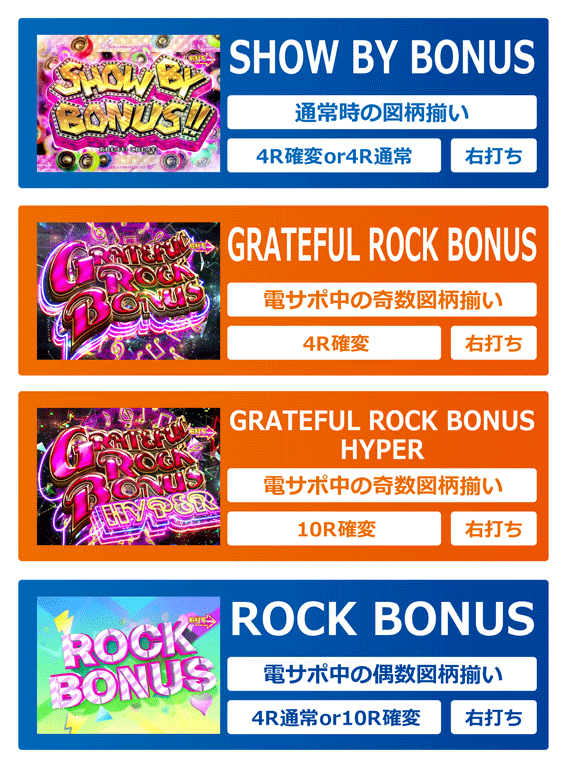 電サポ中に奇数図柄が揃うとGRATEFUL ROCK BONUSが発生。また、大当り開始画面が「GRATEFUL ROCK BONUS HYPER」に変われば10R確変となる。7図柄揃いなら「~HYPER」の期待大!?