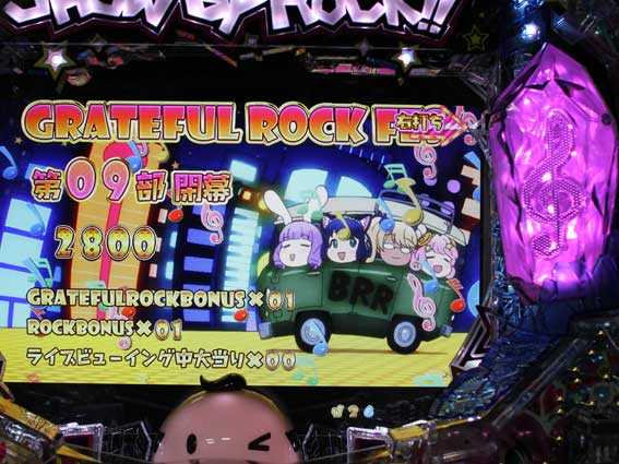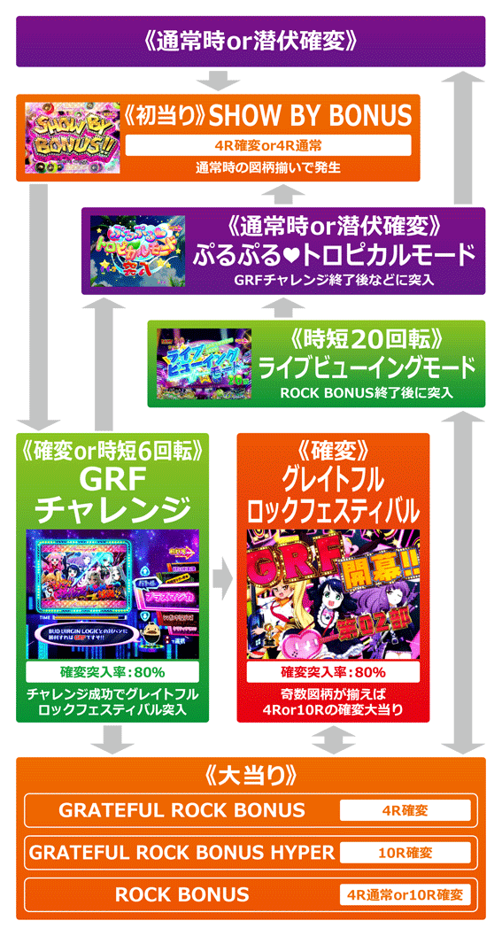 初当り後は必ず確変or時短6回の「GRFチャレンジ」に突入。ここでミッションを達成できれば、確変「グレイトフルロックフェスティバル」に突入する。グレイトフルロックフェスティバル中は、奇数図柄が揃えば4or10R確変濃厚となり確変が継続。一方、偶数図柄が揃ってしまうと4R通常濃厚となり、時短20回のライブビューイングモードに突入する。グレイトフルロックフェスティバル中は、とにかく奇数図柄テンパイに期待しよう!