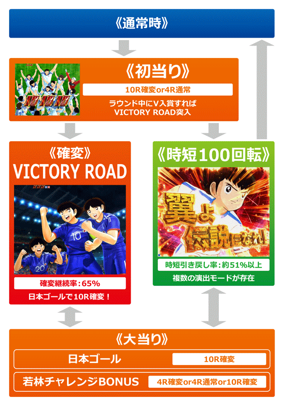 本機の時短は引き戻し期待度が高いのが特徴。なお、初回4R通常後は「小学校編(翼よ伝説になれ)」となるなど、演出モードが複数存在する。