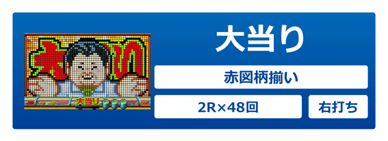 液晶で赤図柄が揃うと大当り当選。2R大当りが48回連チャンするまで右打ち状態が継続する。なお、大当りと大当り間の図柄変動画面では、液晶右下で赤数字が揃うと大当り。握りが揃った場合は2連電チューの上段がショート開放して少量の出玉を獲得できるぞ。2R×48回分と、ショート開放による出玉をプラスすると、平均獲得出玉は約5760個を超える。