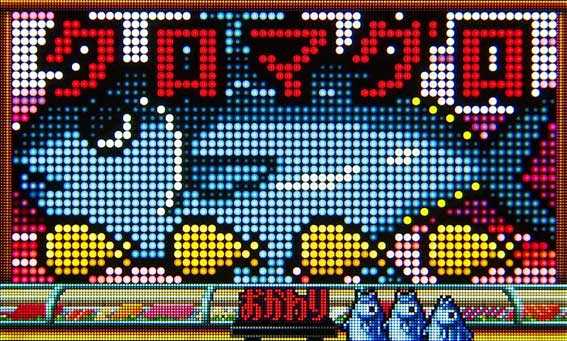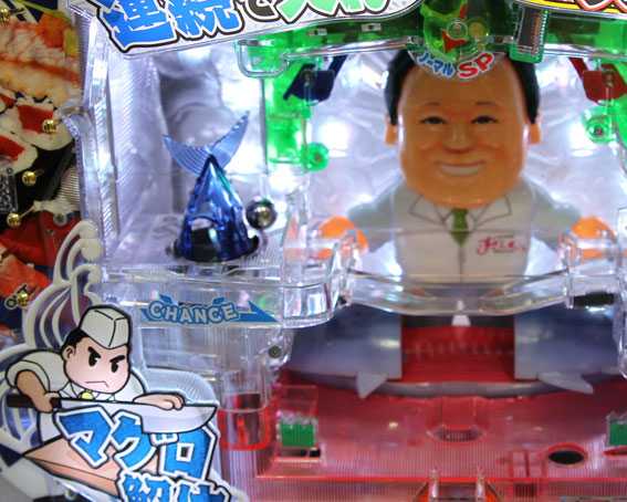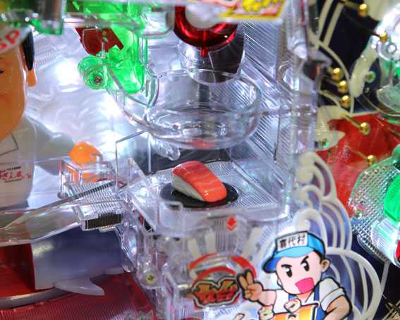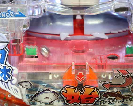 大トロギミックに乗った玉が手前に落ちれば始動口に直入賞。奥へ落ちるとマグロ解体ギミックへ。