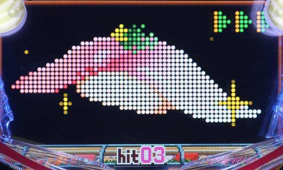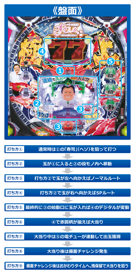大手すしチェーン「すしざんまい」との異色タイアップマシン。役モノ抽選をクリアして始動口に入賞するとデジタルが変動し、図柄が揃えば2R大当り×48回=約5760個の出玉を得られる。本機初搭載のギミック「ちょいアナGO」入賞時は、始動口チューリップが次回入賞まで開放するので入賞率がアップするぞ。セット終了後の「おかわりタイム(特図2の残保留4個)」も健在で、引き戻せれば再度48回ワンセットの大量出玉を獲得可能だ。