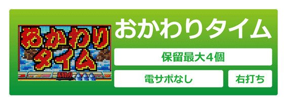 大当り後は備蓄チャレンジを経ておかわりタイムへ移行し、大当り中に貯めた最大4個の保留を消化できる。おかわりタイム中の演出モードは3種類あり、好みのものを選択できるぞ。