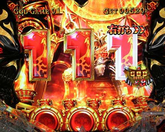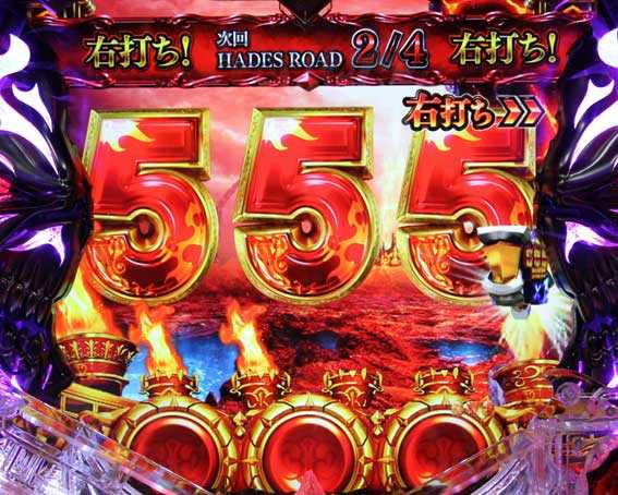 大当りを4回獲得してGGが終了した後は、「ハーデスロード」に突入する。ハーデスロードとは最大4個の残保留消化ゾーン。この4回転の間に1/3.71の大当りを引き当てることができれば、再び約2000個以上獲得となる。ハーデスロード継続率(4回転以内に大当りを引ける割合)は約72%だ。簡単に言うと、GGに突入すれば「1セット約2000個以上獲得できる大当りが約72%でループする」という訳だ。