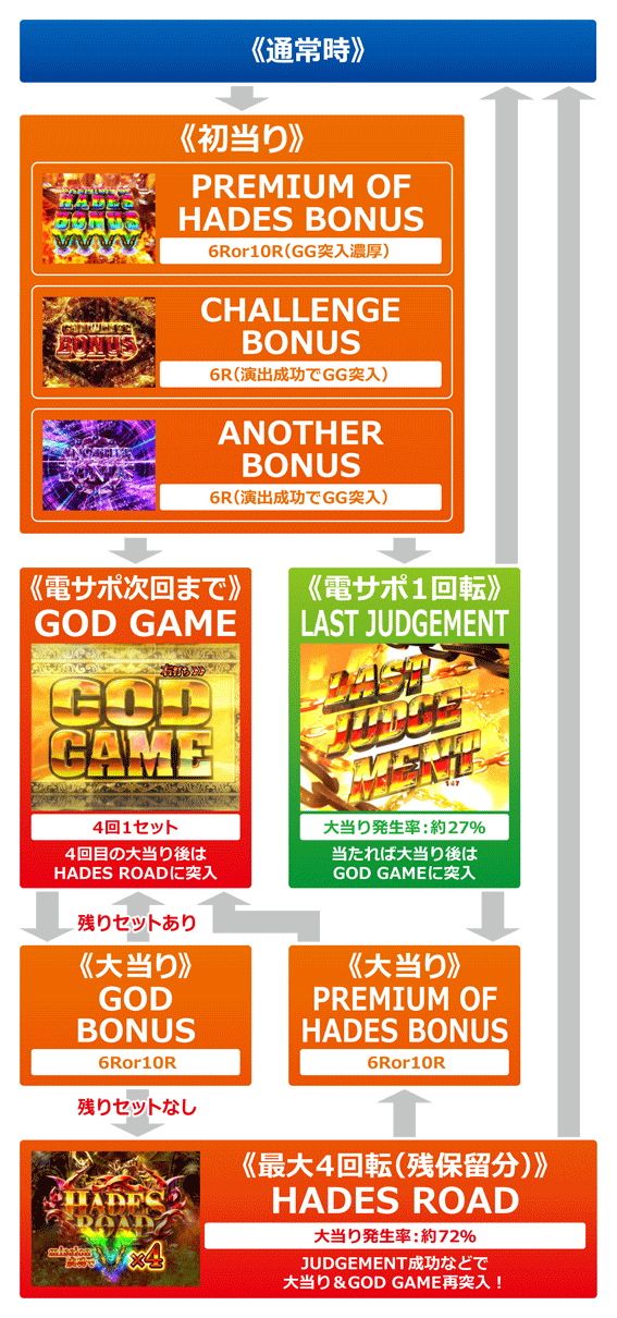 GG中は出玉約500個の大当りが4回発生し、1度の突入で実質約2000個を獲得できる。終了後は引き戻し率約72%のHADES ROADへ突入し、引き戻し成功で再度GGに突入。実質約2000個の出玉とHADES ROADのループが大量出玉を生み出すぞ!