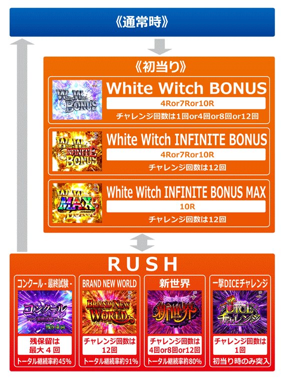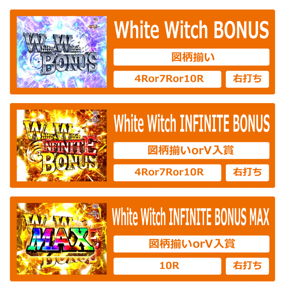 大当りは全3種類存在し、全大当り後に時短「RUSH」へ突入。「ホワイトウィッチボーナス(4or7or10R)」後は時短1or4or8or12回、「ホワイトウィッチインフィニットボーナス(4or7or10R)」後と「ホワイトウィッチインフィニットボーナスMAX」後は時短12回となる。なお、本気チャレ成功時に限り「ホワイトウィッチインフィニットボーナス」が確定する(電サポ中なら「~MAX」)。