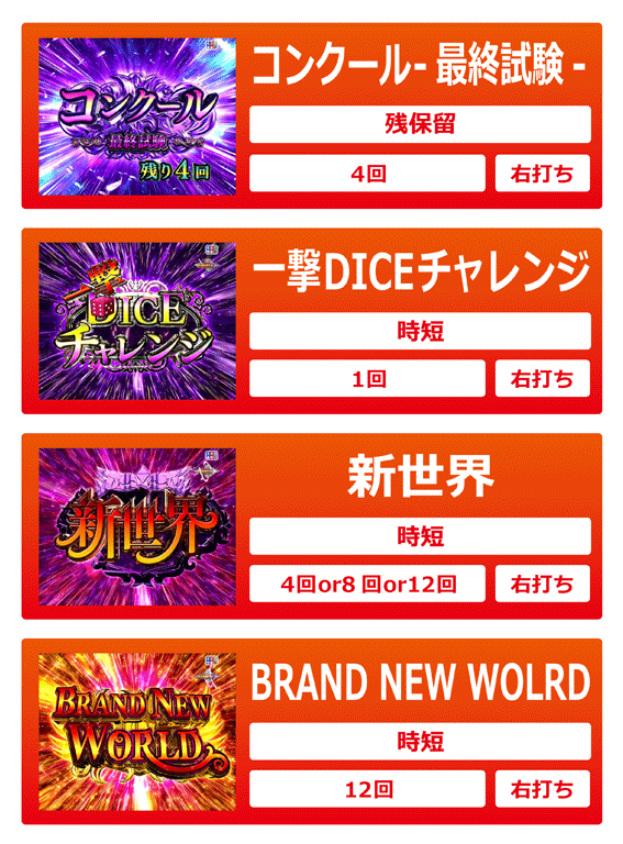 DICEチャレンジはサイコロの停止面で大当りや発展先を決定する演出で、停止面は上記の4パターン。もちろん「コンクール」以外の停止に期待しよう。またチャージ中にサイコロに赤や金の面が出現したり、サイコロがVと新世界だけの面で構成されているなどのチャンスアップにも注目!