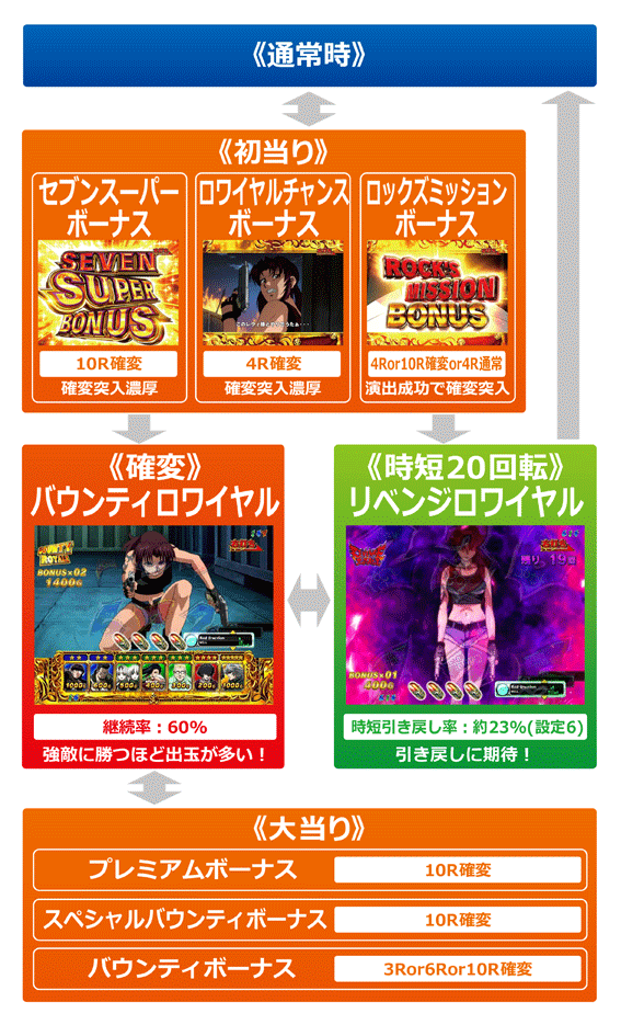基本的な流れは上記の通りで、ロワイヤル演出で対戦相手と報酬(出玉)が決定し、バウンティバトルに勝利すれば報酬獲得&継続濃厚、敗北だと少出玉獲得後にリベンジロワイヤル移行となる。なお、バウンティバトルにはシングルバトルとタッグバトルの2種類があり、仲間が参戦するタッグバトルでは報酬MAX濃厚で、勝利期待度も大幅にアップする。