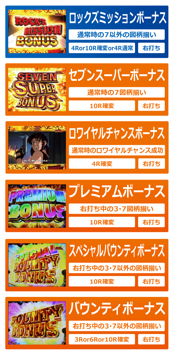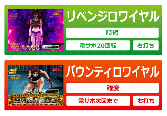ロワイヤル演出に突入すると敵と報酬が決定し、バウンティバトルへの発展が濃厚となる。ロワイヤル演出は全6種類で、演出の種類によってバトル発展時の信頼度が大きく変化。最もアツいのはプラチナロワイヤルで突入すればバトル勝利は貰ったも同然!? その他はチャンスアップパターンの発生に期待しよう。