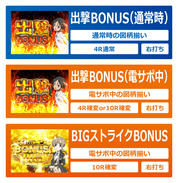 通常時の大当りはすべて4R通常の出撃BONUSとなる。電サポ中に発生した場合は4R確変or10R確変で、ラウンド中にイルミフラッシュが発動すれば10Rに昇格する。