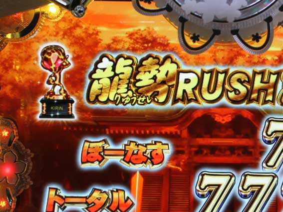 電サポ中の柄揃いで発生する4Ror10R大当り。終了後は龍勢RUSHに突入する。