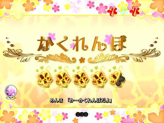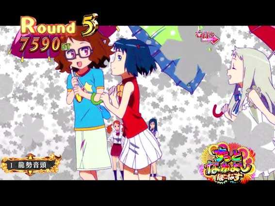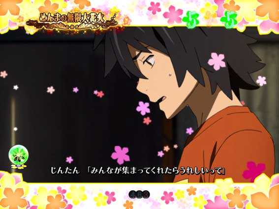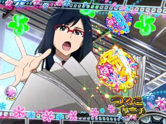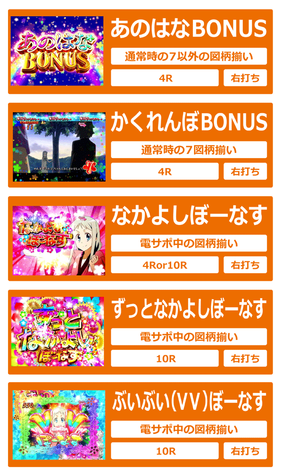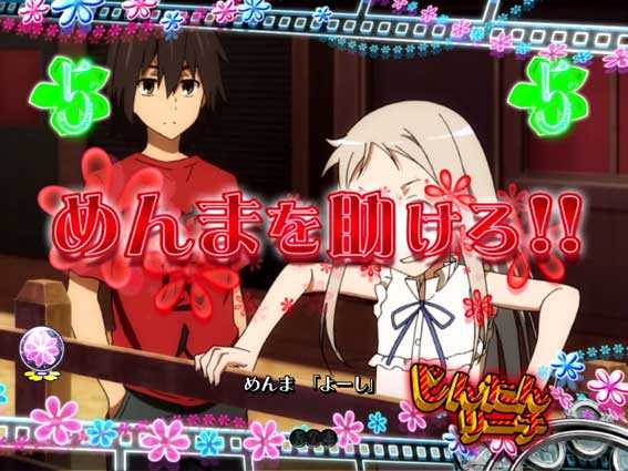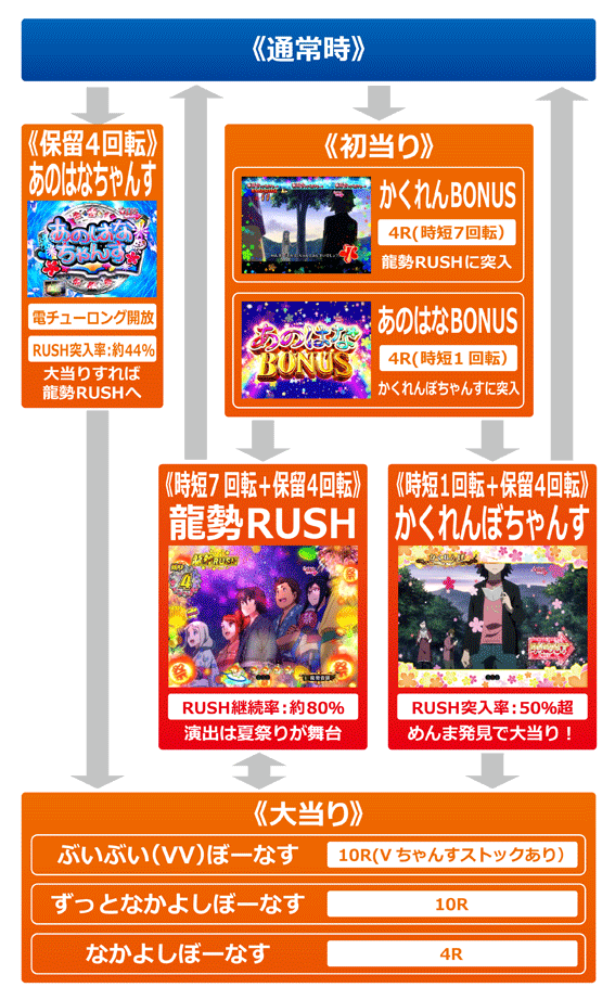 初回7図柄揃いや、あのはなちゃんすの成功、かくれんぼちゃんす中の大当りなどから突入。時短7回転+保留4回転による継続率は約80%と高い。
