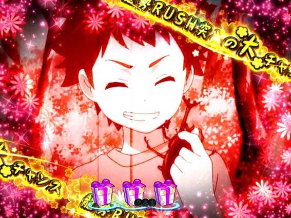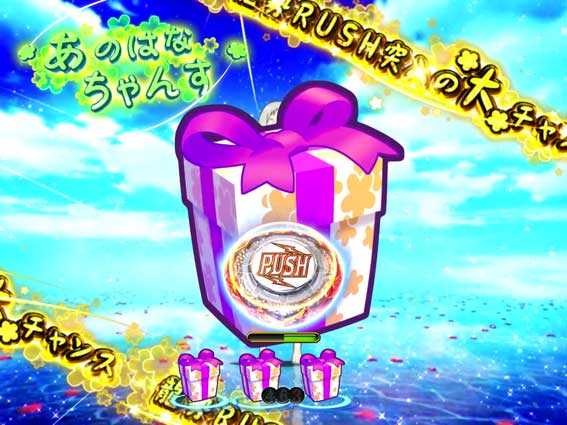 通常の大当り抽選とは別に、電チューロング開放の抽選も同時に行われており、約1/677に当選すると「あのはなちゃんす」が発生。通常時でありながら、保留4個分は右打ち中の抽選(設定6で約1/7.3)が受けられるチャンス演出で、トータル信頼度は約44%と高く、当たれば龍勢RUSH濃厚となる。