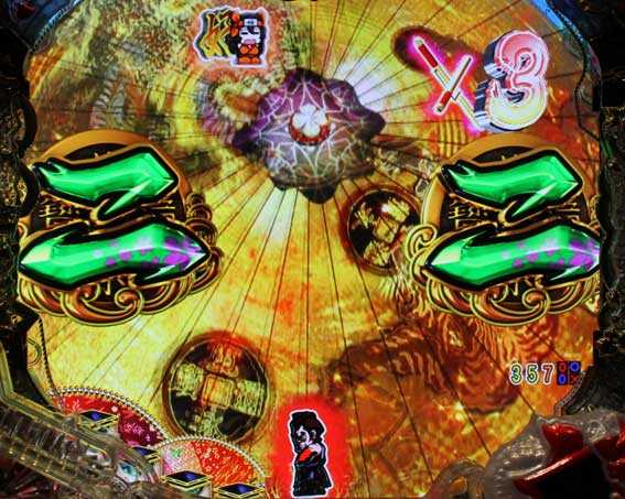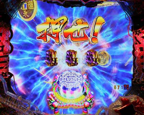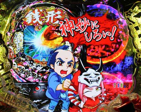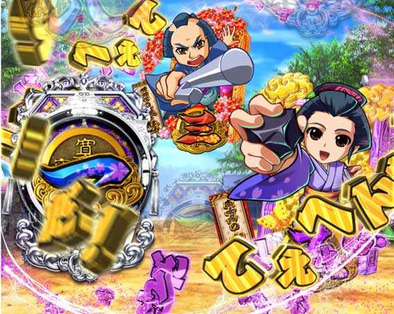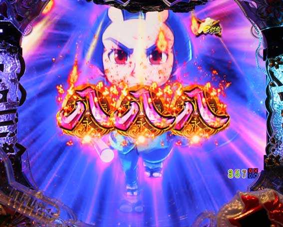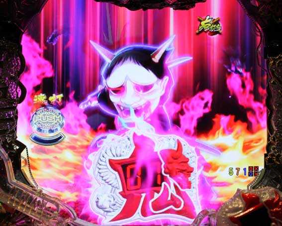 鬼メーターが画面内に出現すると発展。ボタンを連打し、鬼をすべて退治できれば大当りだ。