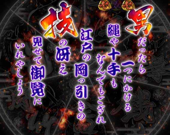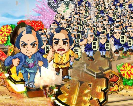 平次や八五郎が加速しながら画面手前に向かってくる。最終的に図柄が3つ揃いで止まれば大当り。