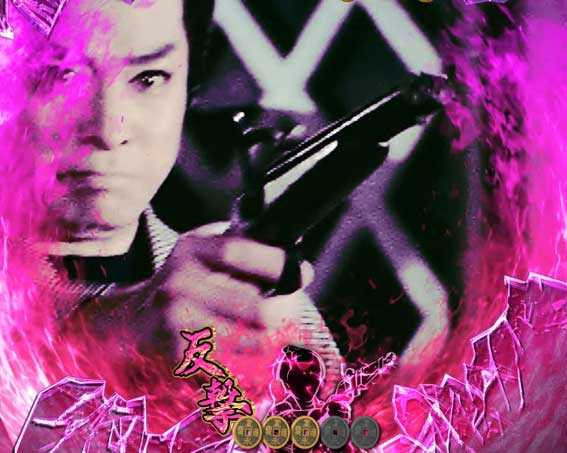 銭が飛んできて画面を破壊すると発展。銭八コンビが悪者を捕まえることができれば大当り。悪者の種類で信頼度が変化し、実写系出現なら大チャンス!