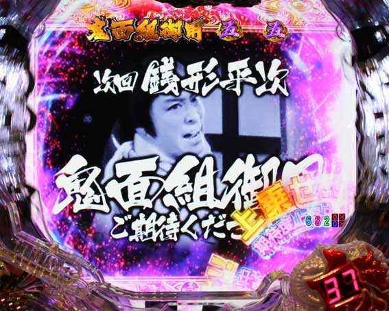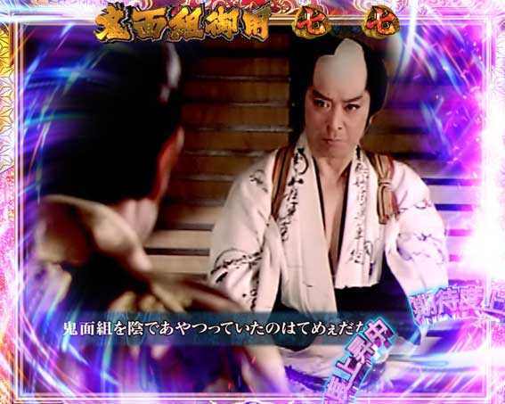 SPリーチハズレ後に十手が飛んできて画面に突き刺さると発展。3・7図柄大当り濃厚!