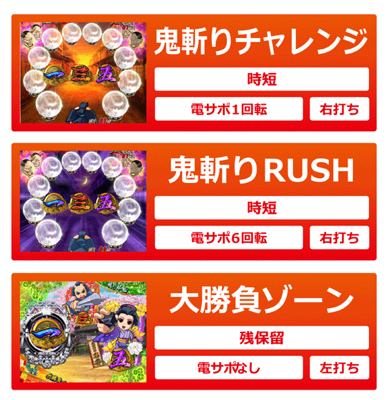 初回3・7図柄揃い後は時短6回転の鬼斬りRUSHに直行、それ以外の図柄揃いや忍子捕獲大当り後は時短1回転の鬼斬りチャレンジに突入し、時短モード終了後はいずれも残保留演出の大勝負ゾーンに移行する。時短中や残保留演出で当たると終了後は鬼斬りRUSHへの突入が濃厚となるので継続率約81%(時短6回転+残保留4回転)のループが期待できる。