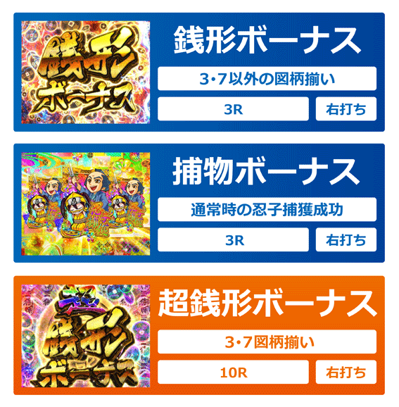変動中演出 | ・擬似連予告(3連) ・銭クラッシュ ・好機到来 ・忍子捕獲予告 |