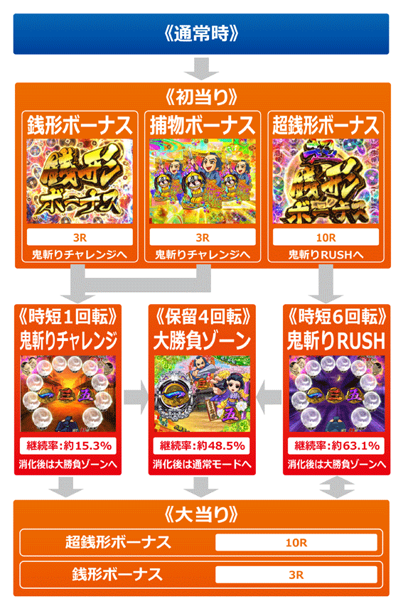 初回超銭形ボーナス終了後や、右打ち中の大当り後に突入する電サポ6回転の時短モード。鬼斬りRUSHの継続率は約63.1%で、電サポ消化後は残保留演出の「大勝負ゾーン」に移行する。