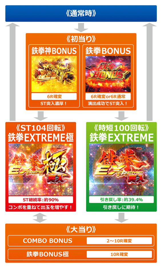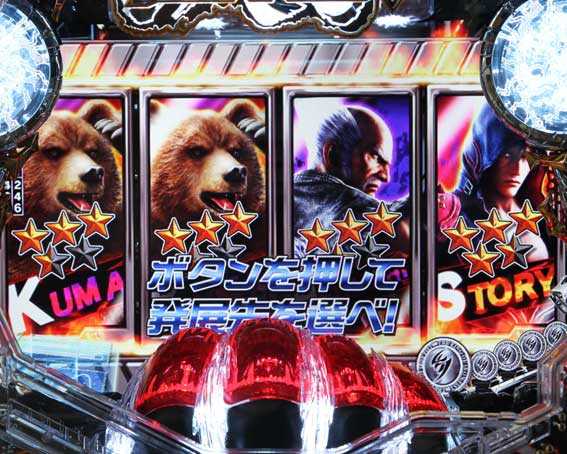 初回大当りが鉄拳神BONUSならST突入濃厚で、鉄拳BONUSの場合はラウンド中の演出クリアでST突入となる。ST中は、前半35回転は即連演出、後半65回転は選択キャラに応じた演出がメインで展開するぞ。電サポ終了後は4回転のバトル(電サポなしST)へ移行し、ココで当たらなければ通常時に戻る。