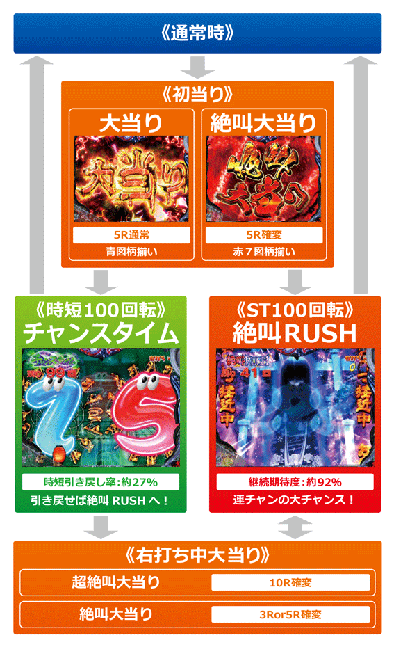 初当りが青図柄揃いの場合に突入する100回転の時短モード。時短引き戻し率は約27%で、引き戻しに成功したら終了後は絶叫RUSHに突入する。
