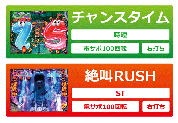 通常時の赤図柄揃いor電サポ中の金以外の図柄揃いで発生。通常時の赤図柄揃いは5R確変濃厚。電サポ中は青図柄揃いだと3R確変or10R確変、赤図柄揃いなら5R確変or10R確変となる。いずれも消化後は絶叫RUSHに突入。