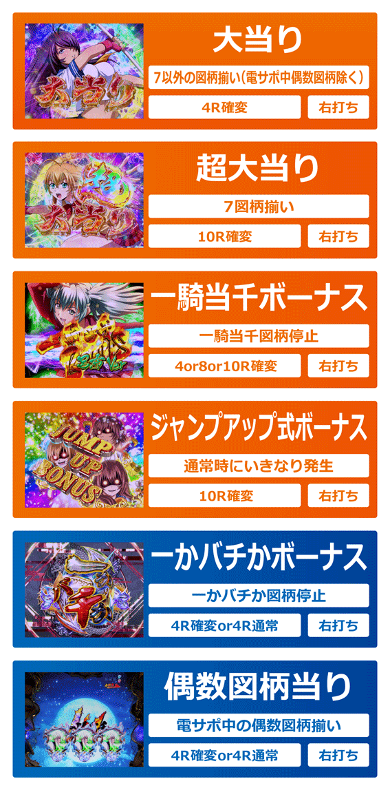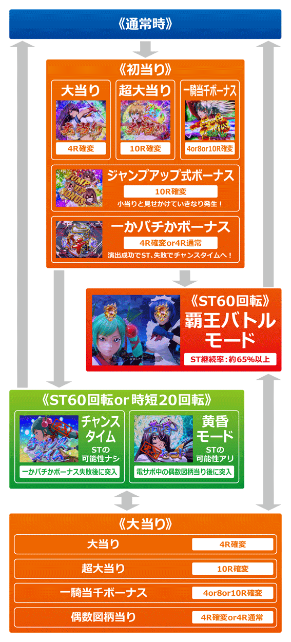 一かバチかボーナスと偶数図柄当り(電サポ中)以外の大当りはすべて確変で、終了後にSTへ突入。一かバチかボーナスは演出成功でST、失敗でチャンスタイムに突入。偶数図柄当りは演出成功でST、失敗で黄昏モード突入となる。