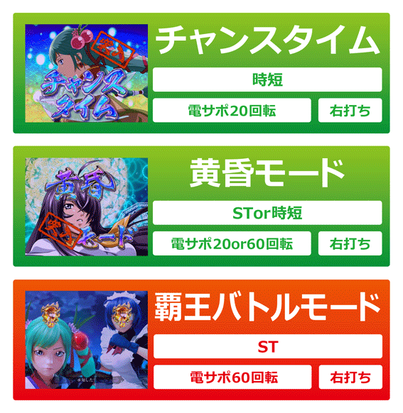電サポ中の偶数図柄当りで演出に失敗すると突入。時短20回転orST60回転の電サポモードで、背景キャラがST期待度を示唆している。液晶演出は覇王バトルモード中のものに加え、専用リーチが用意されている。