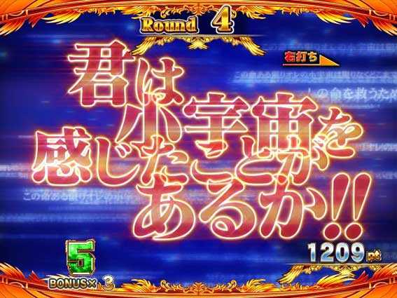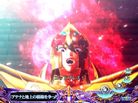 電サポ中の大当りでは、消化中に液晶がブラックアウトして「君は小宇宙を感じたことがあるか」の文字が表示されると保留内連チャン獲得濃厚となる。