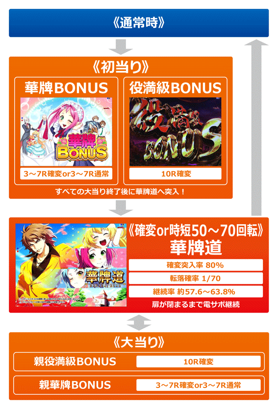 転落抽選タイプだがゲームの流れはシンプルで、すべての大当り終了後に時短or確変の華牌道へ突入。華牌道が確変の場合は電サポ50~100回転+α(規定回転数到達後に転落で終了)、時短の場合は50~70回転だ。