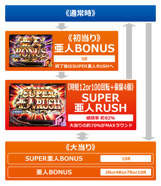 通常時に発生する5R大当りで、終了後はSUPER亜人RUSHに突入。なお、初当り時は約40%が時短100回転となるぞ。