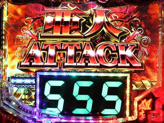 電サポ中の亜人BONUSは2~10Rで、ラウンド数は大当り直前に発生する「亜人ATTACK」や「エクスターミネートラッシュ」などで決定。2Rの場合は終了後に時短100回転、その他のラウンド数なら終了後に時短12回転のSUPER亜人RUSHに突入。