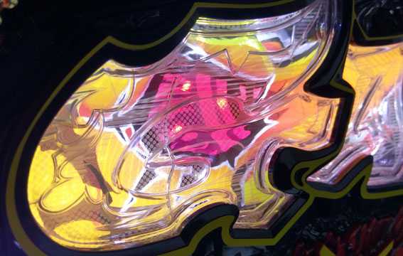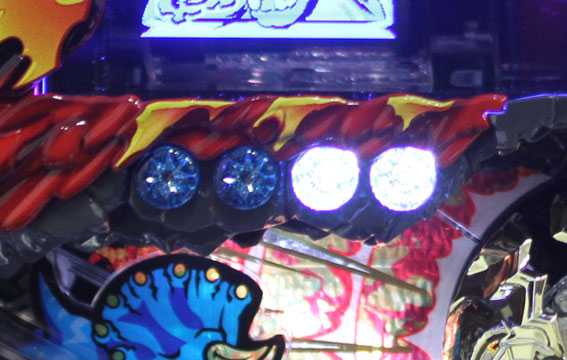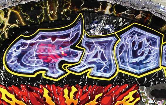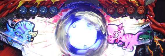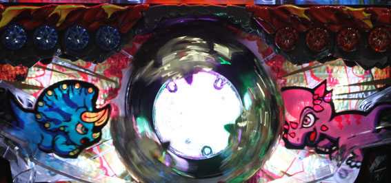 ボタンPUSHでドラム上部のロゴVISIONにT-REXが出現すると大当り。期待大!