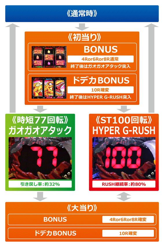 初当りの80%が時短突入となる時短突破タイプ。時短中に大当りを引き戻してSTへ突入するのが、連チャンゲットの王道ルートだ。ST「HYPER G-RUSH」は継続率が80%と高く、大当りの半数がMAXラウンドとなる。また、回転数によって演出が変化するのも特徴だ。