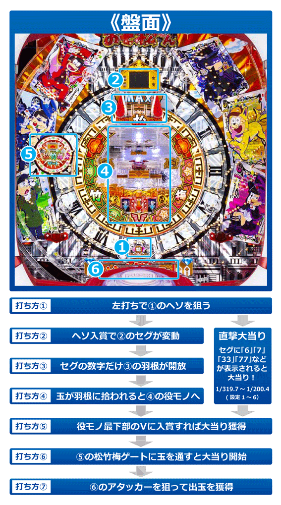 人気アニメ「おそ松さん」が6段階設定付きのハネモノになって登場。大当り獲得ルートはハネモノ本来のV入賞大当りと特図大当りの2種類で、特図大当り確率に設定差が存在する。